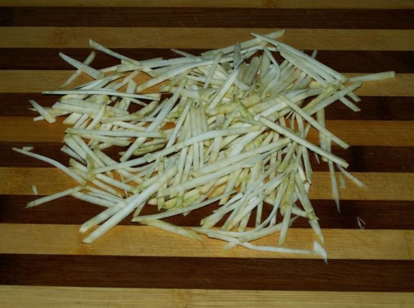- Нарезать тонкими пластинами или соломкой, а можно натереть на крупной тёрке.