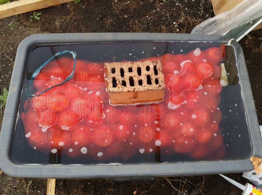 • Зола. Разведя полкилограмма золы в ведре воды и опустив туда посадочный материал, помещенный в сетку, на пару часов, вы защитите урожай от загнивания.