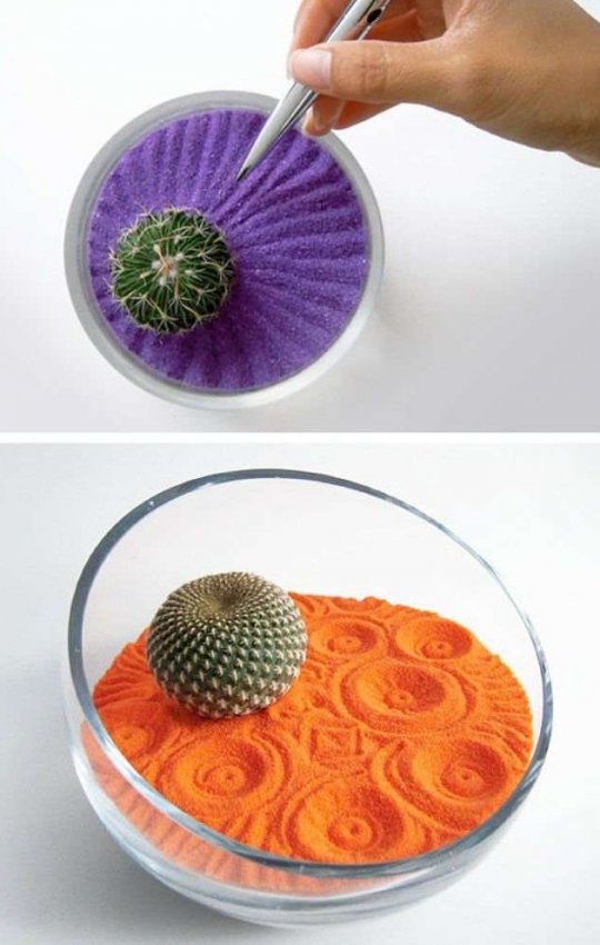 В маленький вазончик или носок, посадить выбранный цветок: на дно положить дренажный слой, а сверху – присыпать подходящей почвой. Насыпать слой песка, сбоку разместить растение, и всё присыпать песком. Верхний слой должен быть ровным и красивым, толщиной не меньше 3-4см. Нарисовать понравившийся орнамент или фигуры. Всё, можно наслаждаться творением.