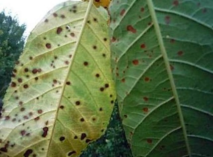 Эту болезнь также вызывают споры гриба. В народе она более известна под названием дырчатая пятнистость. В связи с этим нетрудно догадаться, как выглядят листья пораженного дерева. Отличительной особенностью этого растительного недуга является малиновая кайма вокруг коричневых пятнышек на листьях (смотрите фото). Поражение затрагивает все части вишни, что приводит к потере урожая.