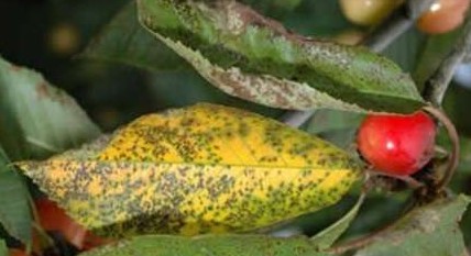 В этом случае грибок в основном поражает листья вишни. На них появляются темные точки, которые в последствии перерастают в пятна. С обратной стороны листа образуется розово-белый налет. Плоды поражаются редко, покрываясь темными точками, как видно на фото.