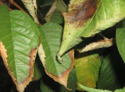 В этом случае поражение грибом проявляется на листьях вишни появлением бурых пятен и усыхании их краев (смотрите фото). Плоды на таком дереве теряют вкус, зеленые – морщатся, спелые – растрескиваются.