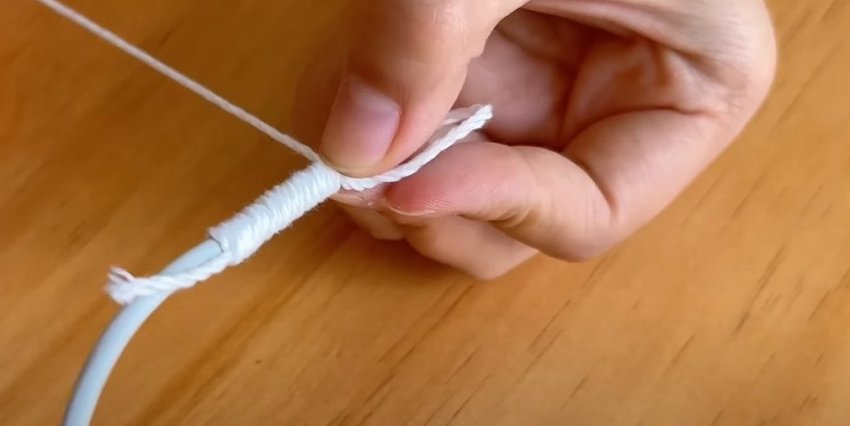 Для дополнительной защиты обмотайте поврежденный участок толстой ниткой. Для этого сложите нить петелькой у основания кабеля.