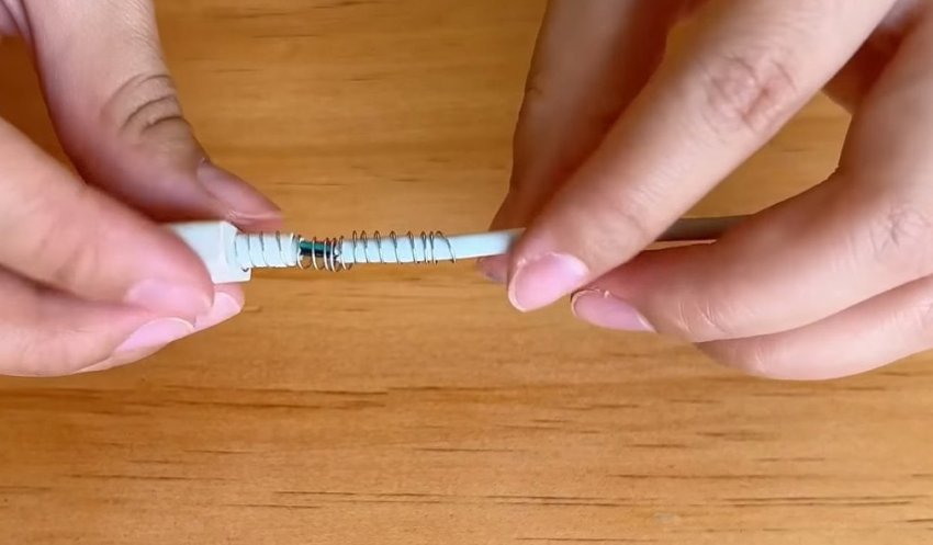 Починить можно даже кабель, в котором оголены провода. Для ремонта потребуется пружина от шариковой ручки, которую необходимо намотать на поврежденный участок.